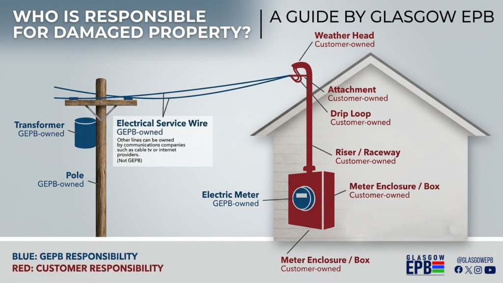 After a major storm, our crews often find that the connection point to a home has been damaged. It is important to know that Glasgow EPB is legally only allowed to repair equipment we own. If the damage is on the customer-owned side, we cannot restore power until a licensed electrician makes the necessary repairs.